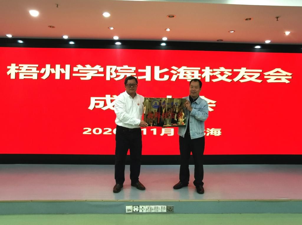 杨奔校长代表学校校友会向梧州学院北海校友会授牌,梧州学院北海校友会会长陈日明代表北海校友会向母校回赠“北海贝雕工艺画”——涠洲岛风光。