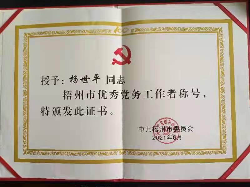 今年6月,我校2004级外贸英语专业校友、梧州市交通运输局机关党委副书记,市交通运输综合行政执法支队办公室主任杨世平由于工作业绩突出,分别荣获“自治区优秀党务工作者”、“梧州市优秀党务工作者”荣誉称号,成为全区150名受到自治区党委表彰的优秀党务工作者之一。