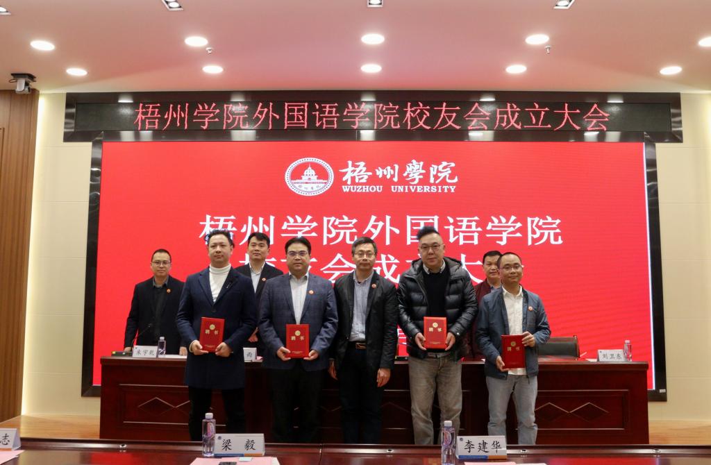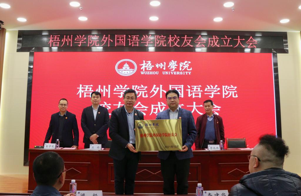 外国语学院校友会会长刘卫东(前排图左)接受梧州学院梧州校友会捐赠