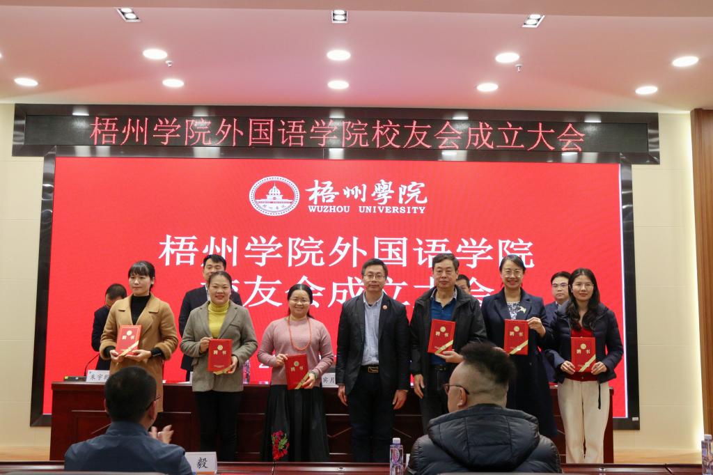 宾月景副校长(前排图中)为外国语学院校友会正副会长颁发聘书