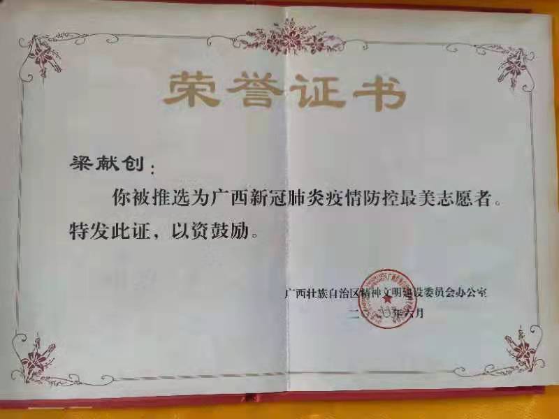 “广西新冠肺炎疫情防控最美志愿者”荣誉证书