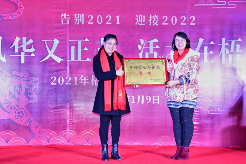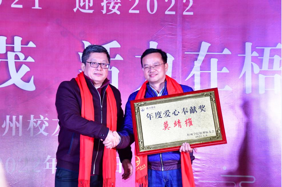 晚会进行间,安排了颁奖和抽奖环节,韦仕珍、杨奔、宾月景等领导为梧州校友会2021年度优秀校友颁发奖牌和证书,为梧州校友会2021年的工作画上了圆满的句号,丰富多样的奖品让晚会现场充满了欢乐喜庆的气氛。